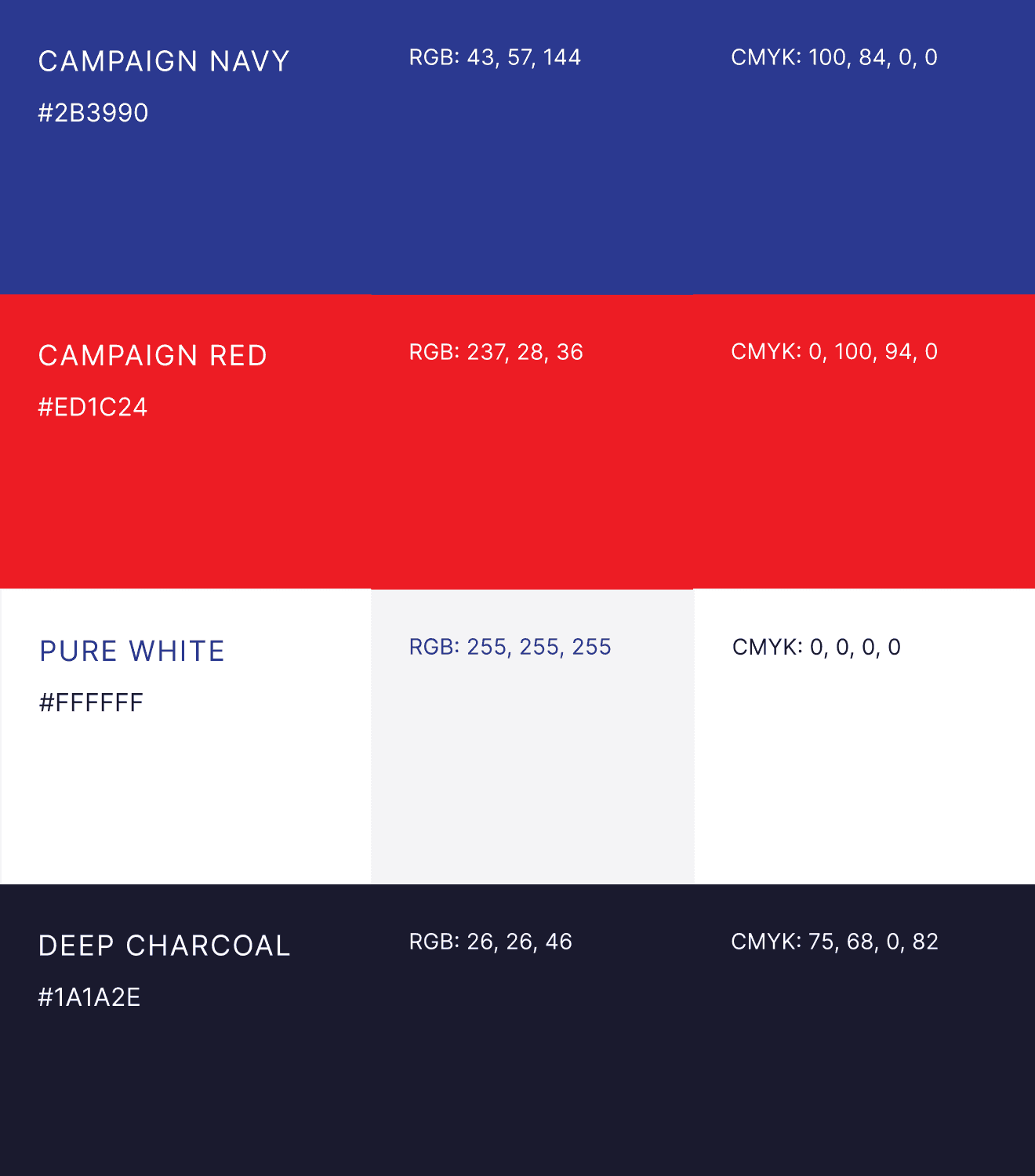 The color system pairs campaign navy and campaign red with clean white for clarity and contrast. Typography is set in Barlow Condensed throughout, giving every piece a strong, confident voice that works across print, digital, apparel, and signage.